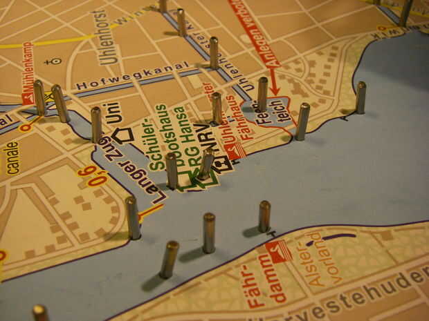 En mi caso, la ruta está restringida a los canales de Hamburgo. Los clavos se colocan en puntos estratégicos: donde da vuelta el canal en buenos puntos de referencia tales como puentes, en otros clubes de deportes acuáticos.