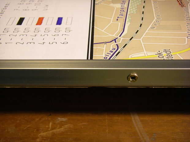 El mapa sólo se mantiene en su lugar con pegamento del papel pintado, así que pensé era una buena idea para proteger sus bordes con un marco de aluminio. Antes de que el marco fue atornillado en su lugar, las notas explicativas se pegan. Se ve profesional y sus bordes tienen que protegerse también.