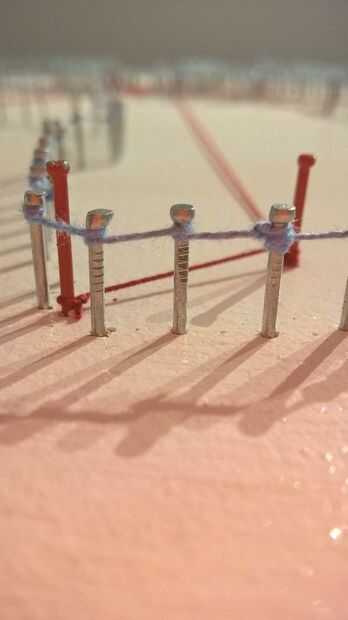 Para marcar el lugar que necesita también un color de uñas diferentes. Para esto he rociado algunas uñas en rojo y dejarlos secar durante algunas horas y ponerlos cuidadosamente en la Junta. Para ello usé un pedazo pequeño de madera para proteger la pintura de rotura de la uña. Yo también hojas un pequeño desnivel entre las uñas de rojos y plata.