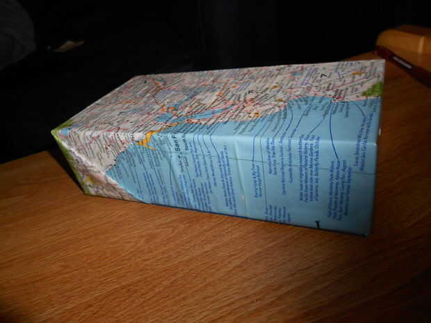 Esto no está en la foto, pero sería una manera más fácil de doblar los lados alrededor de la caja cortar rectángulos en las esquinas y simplemente envolver. Una vez el mapa, extensión ModPodge alrededor de los lados de la caja así como la zona interior de la tapa y envolver el mapa en él. Usé cinta de embalaje transparente para forrar el interior de la caja para el asimiento adicional.