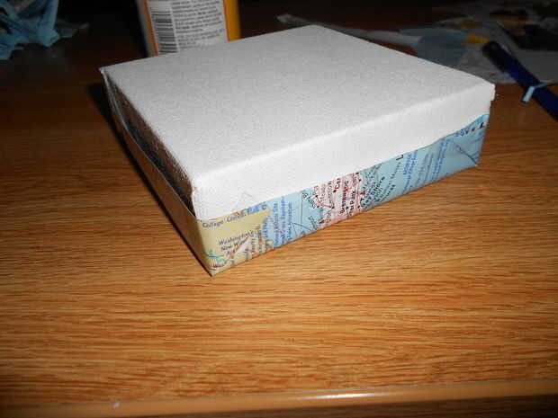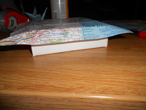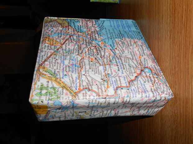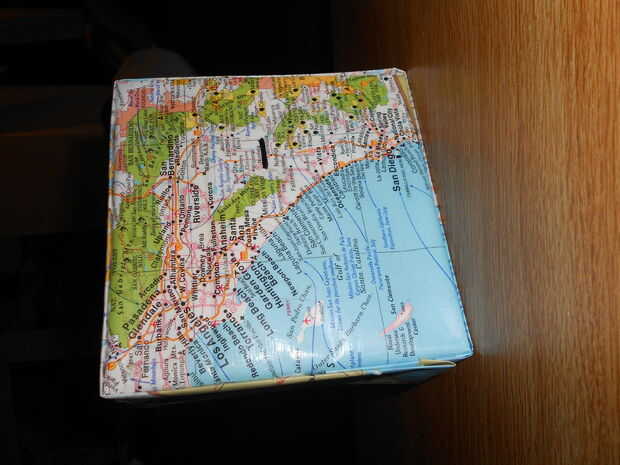Difunda el ModPodge en lado de la tela y colocar uno de los mapas en la misma. Repita para el lado trasero. Envuelva los bordes a lo ancho de la tela.