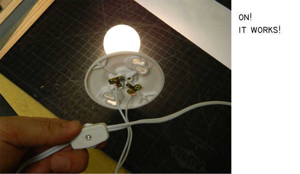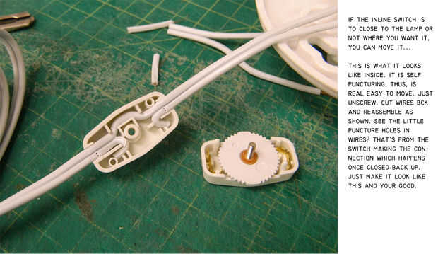3. opcional: Si su línea interruptor on/off está demasiado cerca de la bombilla o donde te guste, puede moverlo muy fácilmente. Sólo Desenroscar el interruptor y moverlo hacia abajo de la línea. Tendrás el portalámparas del alambre después de este paso aunque nada aguas abajo de la línea interruptor tendrá que cortarse porque se cortarán los cables. El interruptor será uno mismo pinchar-lo que significa que se toque en el alambre sí mismo cuando está cerrado. No hay necesidad de soldar o nada de eso. Hacer los cables como la imagen. Toma de 30 segundos.