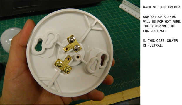 5. alambre neutro el tornillo plateado y el alambre caliente el latón envolviendo el alambre expuesto alrededor del tornillo y apriete con un destornillador. En virtualmente y sostenedor de la lámpara, el tornillo de latón es caliente, el otro tornillo de fijar el neutro. Si el sostenedor de la lámpara se vino con un paquete, se escribirá las instrucciones en la parte posterior.