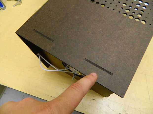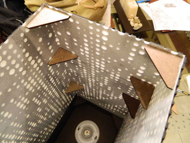 Nota: Si utiliza pegamento caliente, puede quitar los frenillos muy fácilmente sin causar daño. Esto le permite colocar el soporte si es necesario. Tenga cuidado de alinear el 1/8" de espesor apoyo de piezas entre los conjuntos de agujeros, no sobre ellos. Tenga cuidado de no tapar los agujeros o ejecutar la obra a través de los agujeros. Hay suficiente espacio para colocar los componentes de apoyo entre las filas de agujeros. Preocuparse de espaciamiento de los soportes igualmente. No ves, y será muy cuidadoso para intentarlo. El interior puede ser feo... no ver nada allí.