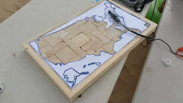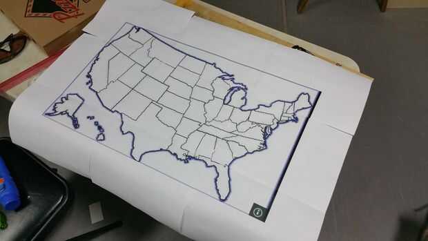 Ahora para la diversión. Primero, use su programa favorito para ver un mapa de los Estados Unidos para adaptarse a la pieza de trabajo. He utilizado Microsoft Publisher y encontró un mapa genérico de Estados Unidos. Desde aquí, imprimí un mapa escalado para caber mi pedazo de madera. He pegado abajo y utilizar la Dremel para grabar el mapa (va ir a la derecha a través del papel con la punta de grabado). Una vez grabado, volver sobre las líneas otra vez para hacerlos tan profundamente como sea posible. Esto asegurará que no desaparecen cuando nos lijar. Asegúrese y doble Compruebe todas las características y grabado y será buenos para ir!