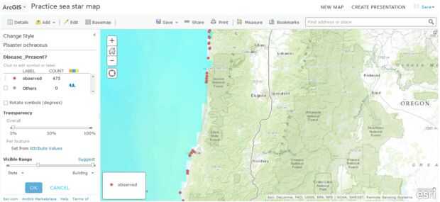 - Seleccionar primero qué campo por el cual desea distinguir puntos de datos. Tenemos varias opciones. Nosotros podemos querer distinguir puntos por año, tipo de hábitat, o si la enfermedad fue observada. Seleccione en el menú desplegable "atributo para mostrar". Seleccioné "enfermedad observada".