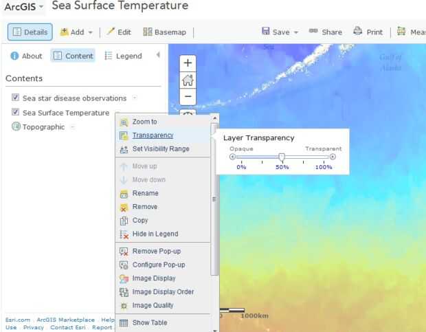 Transparencia: puede hacer capa de datos transparente para que pueden visualizar capas abajo. Por ejemplo, vamos a ajustar la transparencia de la capa de SST que se observan nombres de ubicación y topografía del mapa base.