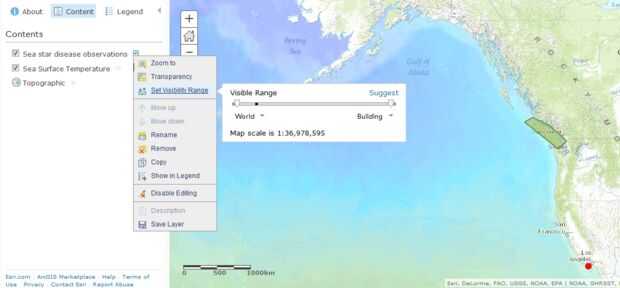 3. Ajuste la barra deslizante de los extremos de modo que la capa es visible para el rango que desea; también puede ajustar seleccionando la opción mediante el desplegable de menús en cada lado de la barra deslizante (puse mina para ser visible del mundo para los grandes países). Usted puede hacer un ajuste similar para las observaciones de la enfermedad. Configurar mina sea visible de los continentes a las calles.