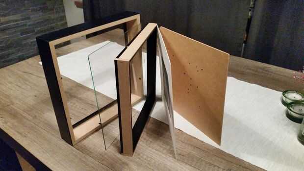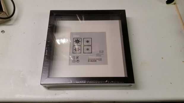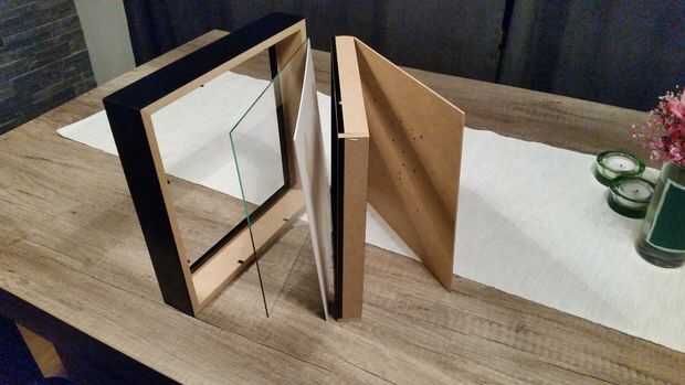 He desempaquetado el marco y vio al separador entre la parte posterior y el cristal es removible. Así que cambié el orden de las partes dentro del marco. En primero viene el vidrio, luego el picaporte a la que se conectará el cuadro, entonces el separador y finalmente la parte de atrás. Con el orden cambiado, ahora tenemos algo "oculto" de espacio entre el vidrio y la parte posterior.