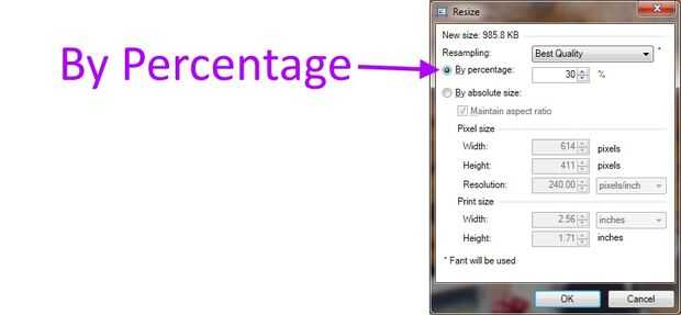 Para cambiar rápidamente el tamaño una imagen, presione "ctrl + r". En el menú emergente menú, seleccione "Por porcentaje" y luego escriba un número en el cuadro. 50% hará que la nueva imagen de aproximadamente la mitad de su tamaño actual. Por supuesto, por el tamaño, estoy hablando sobre el tamaño del pixel, no el tamaño de la imagen en la pantalla. Estas son dos cosas muy diferentes.