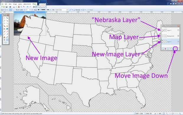 Como se mencionó en el último paso, habrá pegado la nueva imagen en una capa encima de cualquier capa fue seleccionado. Utilizando la Flecha hacia abajo en la caja de herramientas "Capas", mover esta nueva imagen hasta el fondo de la lista de capas (o al menos, a apenas debajo de la capa de mapa).