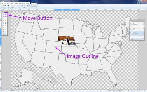 Con la Herramienta Mover, mover la imagen con el agujero a la izquierda del corte estatal. Usted puede hacer clic en más en cualquier lugar dentro de las fronteras de la imagen o el cuadro de la pequeña flecha en la esquina inferior derecha de la imagen, para moverlo.