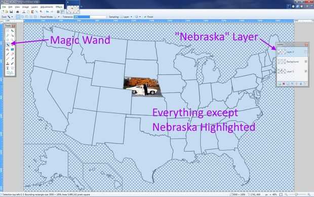 Seleccione la capa de estado invisible que cortar y pegar en los pasos 7 y 8. Una vez más, utilice la herramienta Varita mágica increíble para seleccionar toda la imagen que no es el recorte del estado. Hacer esto haciendo clic en cualquier lugar es decir no ese estado. Bastante simple... Debería ver toda la pantalla destacó excepto lo del estado le están trabajando.