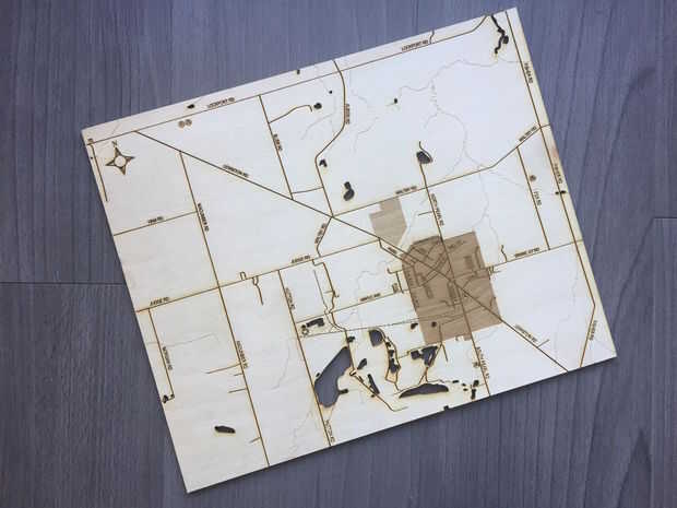 Cuando crear el láser corte del mapa de su ciudad natal, usted tendrá la oportunidad de personalizarlo para su familia. En la mía, he marcado lugares de mi padre ha vivido en casas y otros lugares importantes. Un ejemplo sería para tres generaciones, su familia trabajado en las minas de yeso en la zona. Aunque las minas están cerradas, todavía trabaja para esa empresa. Destaco su ubicación en el mapa, así como la high School secundaria asistieron él y sus hijos (eso yo y mi hermana).