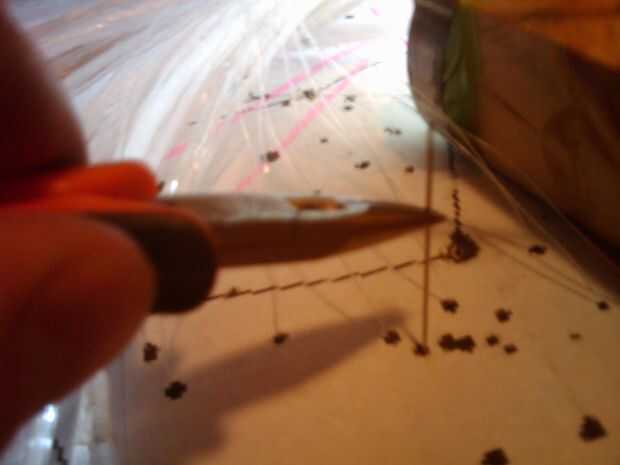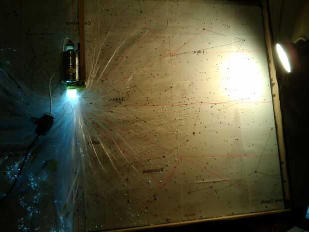 Para cada pequeño punto de luz, haga un orificio a través del sustrato con una aguja resistente. Cartón grueso es difícil, por lo que tendrá que pasar la aguja con la ayuda de un par de pinzas. Ver el MkII-agujero-meter-dispositivo en la segunda imagen, harán tu vida mucho más fácil! (Si utilizas algo más duras, como madera contrachapada, necesitará perforar cientos si no miles de pequeños agujeros con un taladro. Buena suerte. :-) )