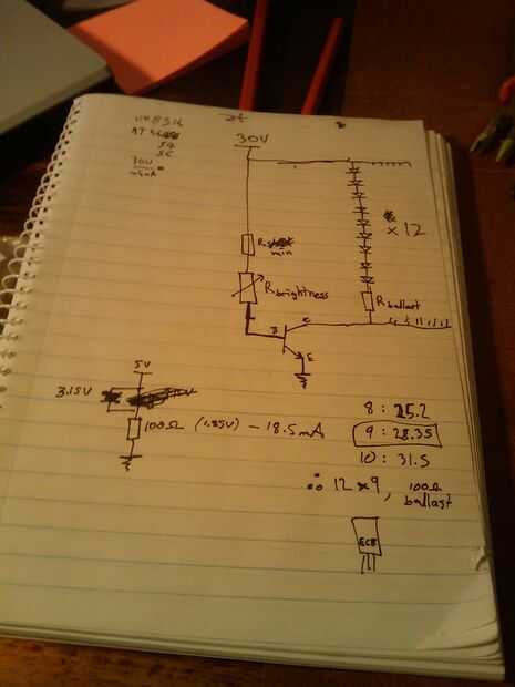 Para una tensión de alimentación dada, se puede ejecutar a N LEDs en serie, donde N* adelante caída de tensión es inferior a la tensión. En el brillo completo, los LEDs utiliza tienen una caída de tensión directa de 3.15V. Si tengo una fuente de alimentación de 30V, puedo ejecutar hasta 9 LEDs en serie con una resistencia de balasto pequeño. (No olvide sin embargo, en la mayoría de los casos un resistor de lastre todavía será necesario)