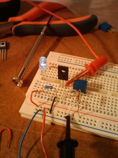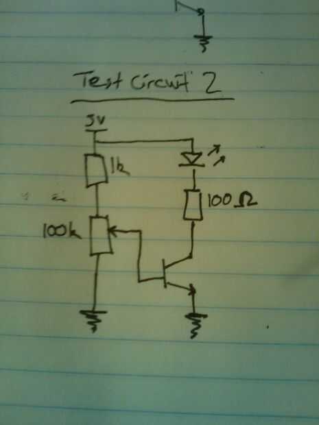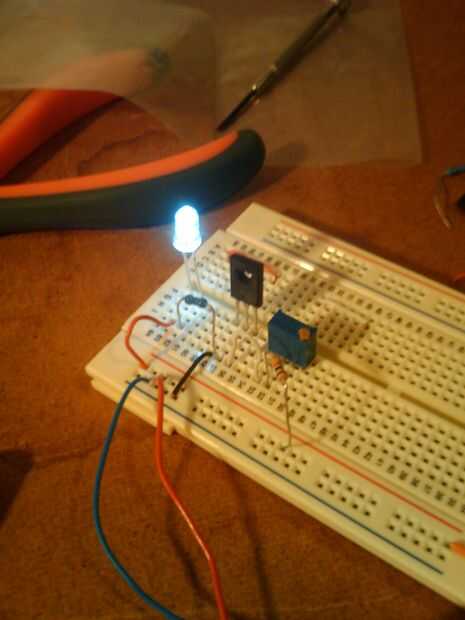 Como el esquema siguiente muestra un potenciómetro controla el voltaje y por lo tanto la cantidad de corriente que fluye en la base de un transistor NPN. El transistor permite una cantidad proporcional de corriente fluya a través de él, así que controla el brillo de cualquier LED conectado. Mi circuito de prueba controla un indicador luminoso de una fuente de 5V, pero el principio de 108 LEDs era exactamente el mismo; sólo tiene que conectar los extremos negativos de las cadenas de LEDs/resistor para el transistor, en vez de directamente al suelo.