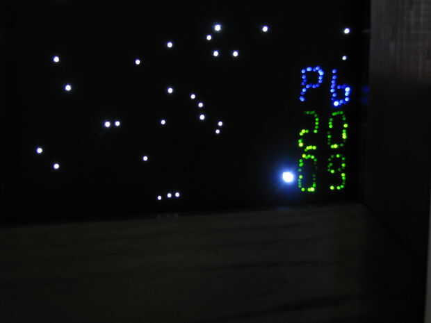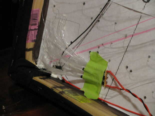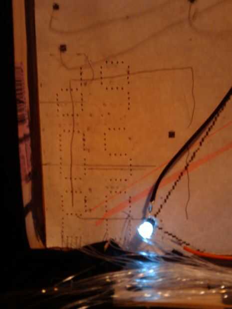 Estos LEDs están conectados a la misma fuente de alimentación de 30V como las otras fuentes de luz secundarias. El circuito es simplemente tres LEDs en serie con una resistencia de balasto apropiado, soldada a un trozo de la veroboard.