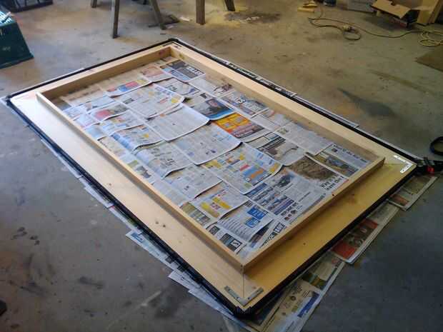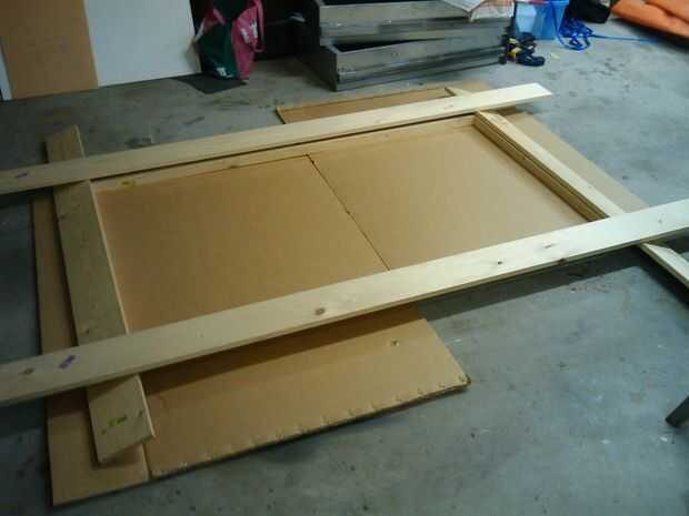 El exterior del marco: 200x19mm pino (o una madera decorativa si se desea) se construye un marco plano articulado de Mitre, con el mismo espacio interno. Otra vez, este marco se verá, por lo que puede ser construido decorativo si se desea. Como se muestra en la segunda foto, estas piezas se guardan junto con escuadras. Una correa tensa alrededor del exterior del marco ayudará a mantener cuadrada hasta que se unen las placas de ángulo.