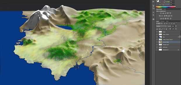 Añadir una capa debajo de agua y árboles. Hacer el modo de fusión "superposición" y elija un pincel grande, suave, marrón. Pintar el suelo. Ajustar la opacidad / color como sea necesario para obtener el color de la tierra que desee.