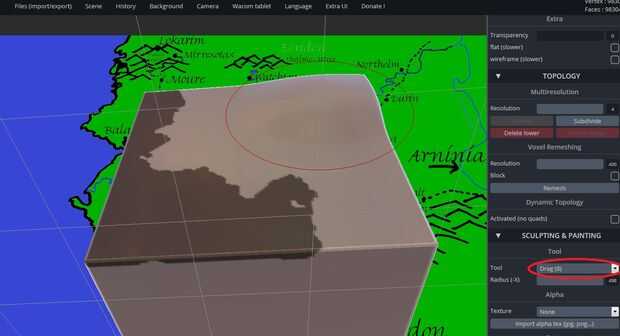 Utilice la herramienta de "Arrastrar" con un radio grande para arrastrar hacia arriba y crear la general cuesta subyacente de tu mapa (si existe).