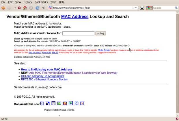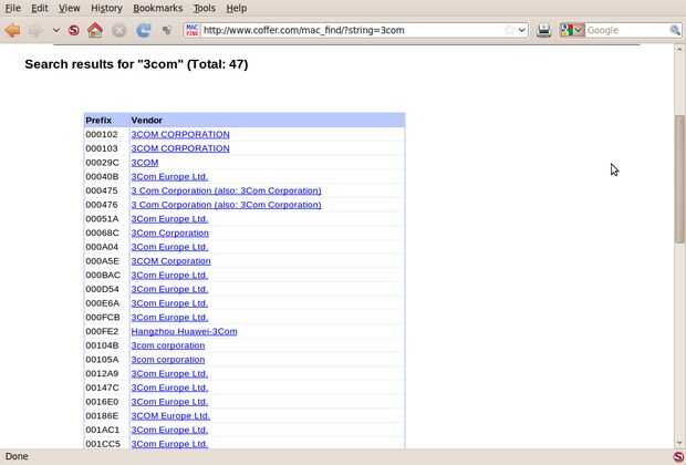 Identificar el fabricante de una tarjeta nic (tarjeta de interfaz de red). Esto puede ser muy importante si quieres ver qué tipo de equipo se conecta a la red. Cada nic tiene un mac (dirección de control de acceso a medios) y generalmente los primera varios personajes de ese número hexadecimal normalmente indican el fabricante (vendor) del equipo.  Si usa más o menos el mismo equipo en la red, un listado de las direcciones mac se utilizan permitirá un dispositivo Pícaro a ver muy fácilmente.  Es una buena idea mantener una lista de todas las direcciones mac se utiliza para comparar contra lo que se está utilizando. Averiguar qué proveedor hizo una nic hace más fácil encontrar un sistema no fiable. Por ejemplo, en la escuela donde solía trabajar bastante utiliza 3com NIC. Generalmente, si un estudiante intentó conectar su computadora a la red, podrían tener una nic Realtek basado en lugar de un 3com. Las direcciones mac se pegarán hacia fuera como un pulgar dolorido. el dhcp server para obtener una lista de clientes conectados es la forma más fácil de ver lo que está conectada si jNetMap no está conectado o no tiene ningún software para ver lo que está en la red.