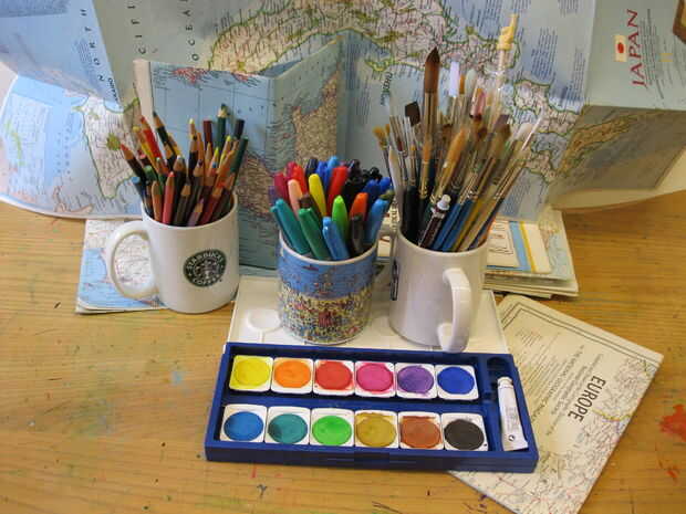 Insumos para este proyecto son muy básicos.  Se necesita un mapa y el dibujo (o / y acuarelas) materiales. Me gusta usar varios marcadores, lápices de colores y metálicos.