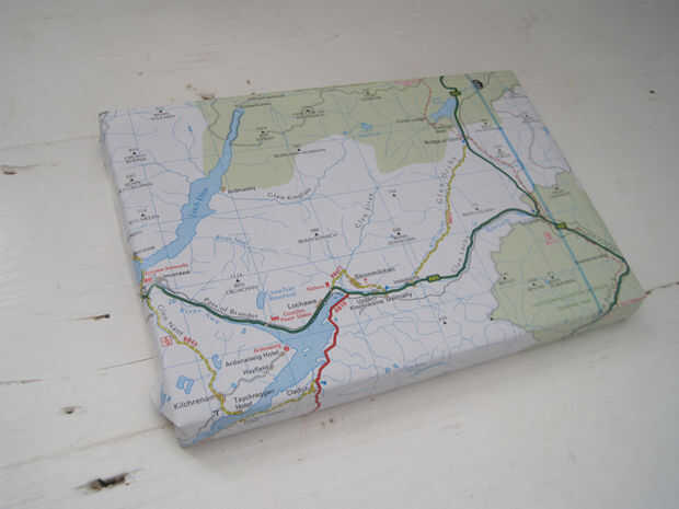 Simple pero muy eficaz. Los mapas son tan maravillosamente gráficos y verlos en una situación inusual como la envoltura para un regalo hacen el presente más sorprendente.