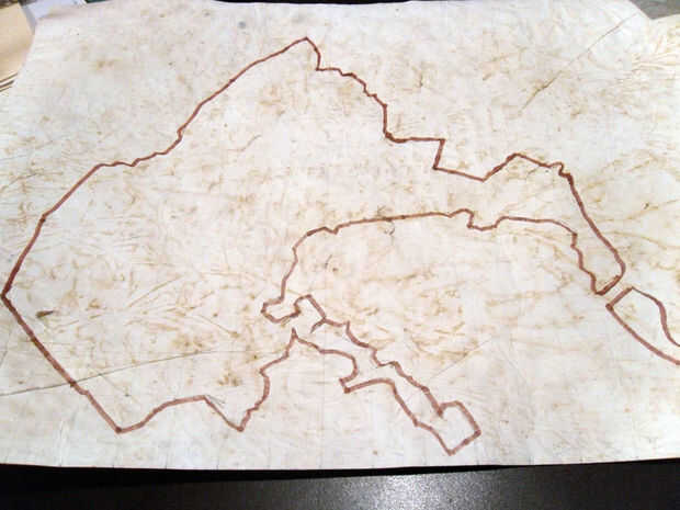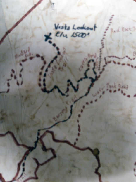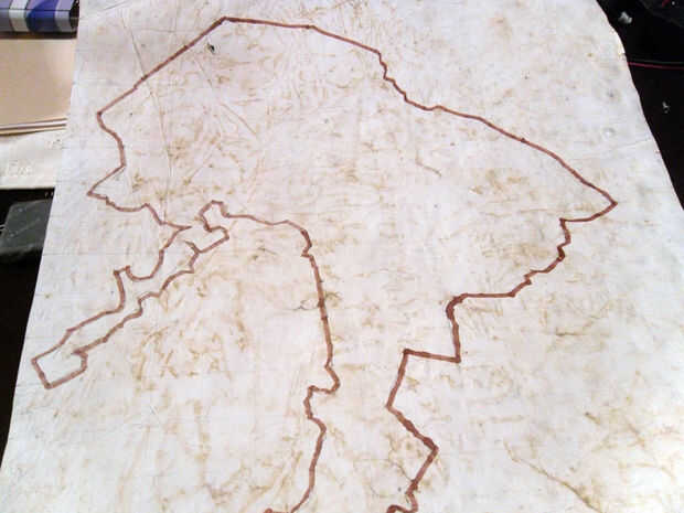 Después de que se seque la tinta luego iría detrás y marque los senderos (con una punta más pequeño) y otras características deseadas. Una vez que los senderos están marcados utiliza tinta negra para marcar caminos y para ir sobre el camino real tuvo. X marca el lugar. Yo entonces había trazada en la carta de título del mapa y el trazado les con la punta más grande en color marrón.