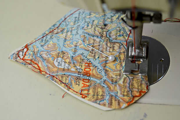 Lugar sus dos mapa lados mal corazones juntos y cosen alrededor del borde en una máquina de coser. Asegúrese de que dejar un hueco para insertar tus dulces.