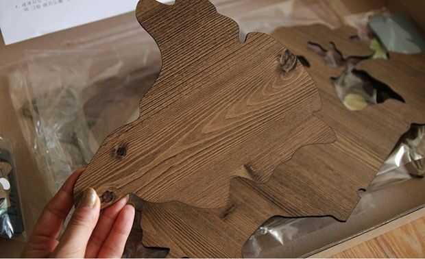 Madera mapa del mundo como piezas de rompecabezas como esta y tiene etiqueta en la parte posterior para colocar en la pared, pero relojes son más pesados que las piezas, clavado por lo tanto se debe hacer para 3 relojes.