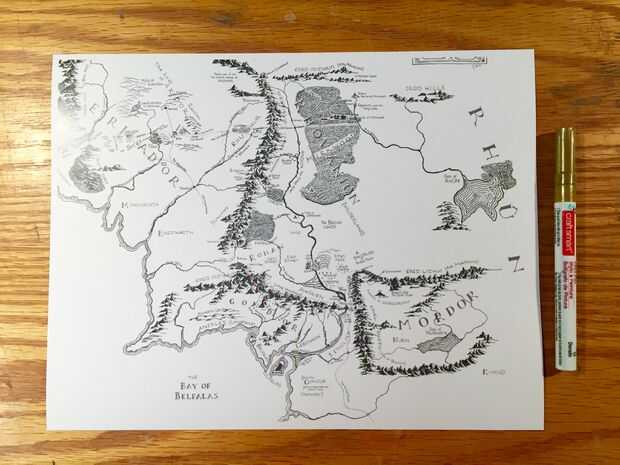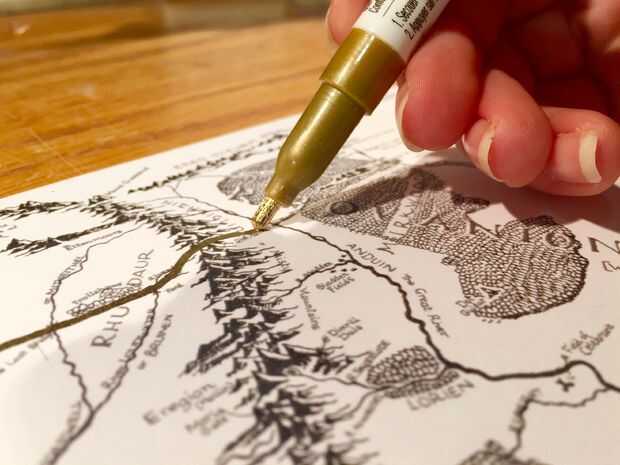 Comience dibujando la ruta en el mapa. Seguir una referencia visual (grito hacia fuera al Proyecto del Señor de los anillos! Esas personas hacer cosas sorprendentes y me deja exactamente mapa viajes Thorin & Co además de Frodo y de Sam sin necesidad de escarbar la historia yo mismo) y a mano alzada, o ligeramente lápiz la ruta en y luego ir sobre ella con el lápiz de pintura