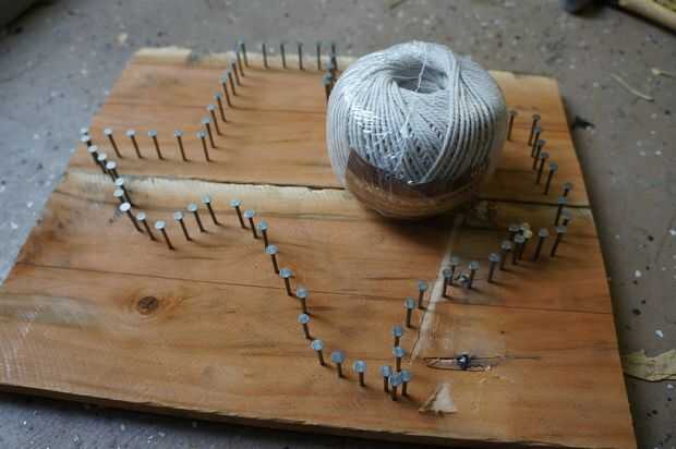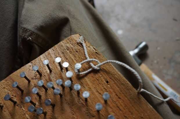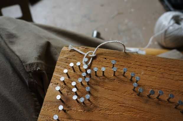 En primer lugar, usted necesita anclar en el extremo de la cadena de modo que usted puede mantener tenso como distribuirlo alrededor de las uñas. Hacerlo yo solo haga un enganche de medio nudo alrededor de uno de los clavos. Déjese unos 4" holgura para ayudar a prevenir de deshaciendo. Asegúrese de que lo buena y apretada ceñir a y tirando un par de veces para asegurarse llevará a cabo. La carga en el nudo debe disminuir tan pronto como usted comience envoltura para no dejarse demasiado lejos tratando de apretar. En dos de las piezas que hice pude obtener con sólo un nudo de atar. Sin embargo, si no está seguro de su enganche de medio nudo, atar una segunda para la buena medida.