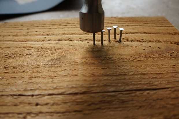 Por más contradictorio que parezca, trato de ser suave con el martillo. Con la ayuda de los orificios piloto, debería ser relativamente fácil el manejo de las uñas. Se hace muy evidente cuando golpeas el fondo del agujero, y trato de no empujar mucho más allá de este punto. Hago esto porque: