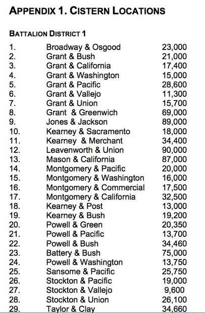 Renové mis esfuerzos de búsqueda buscando así y cisternas y finalmente encontró este fuego suministros manual. En la parte posterior el PDF era un listado de todas las intersecciones en San Francisco (169 de ellos) donde se encuentran las cisternas.
