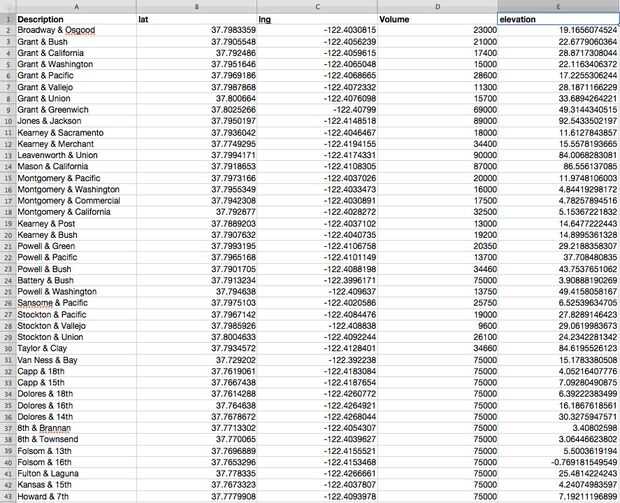El resto de las columnas son personalizados: he añadido la descripción (el nombre de la intersección), el volumen y elevación. Estos aparecerán en nuestro mapa en línea después.