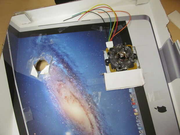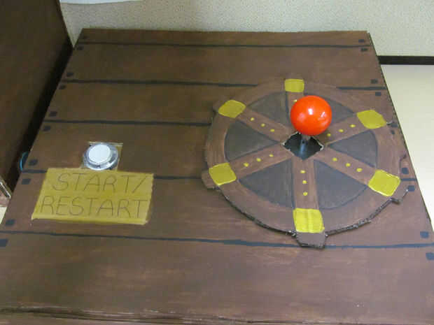 Decidir donde desea el controlador para ir. Utiliza un joystick para navegar en cada uno de los cuatro puntos cardinales y un botón arcade para reiniciar. Una vez hayas seleccionado lugares para estos artículos, cortar los agujeros en el cartón para que encajen a través. Fijar con cinta y piezas de cartón extra.