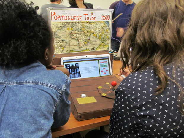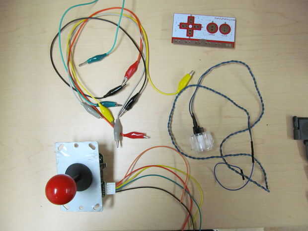 Una vez que esas son seguras, gancho de tu botón y joystick para un Makey Makey. Se trata de una manera fácil para que el dispositivo hable con el equipo. Conectado el joystick a leer como las cuatro flechas y el botón de la tecla W. Max 6 puede leer estos dispositivos como insumos fundamentales y responder en consecuencia.