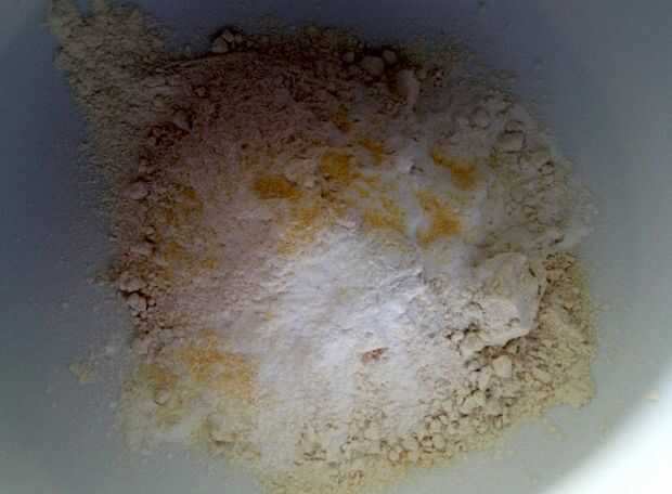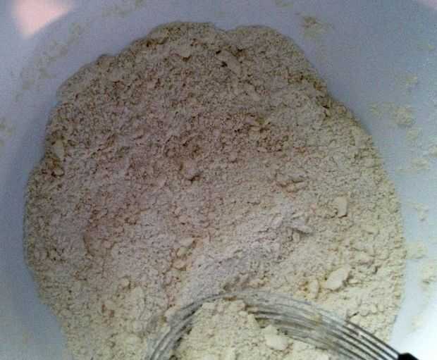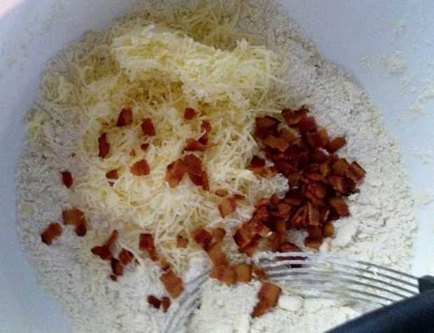 Batir harina, polvo de hornear, sal y ajo en polvo en un tazón grande hasta combinar. Añadir el tocino congelado en trozos (se rompió para arriba la grasa con un esparcidor queso pequeño) del tazón de fuente, agregue la mantequilla y usar un cortador de pasta o dos tenedores, para mezclar la mantequilla y el tocino en la mezcla de harina hasta que la grasa y mantequilla se cubren con harina y hay muchas piezas de tamaño de un guisante en la mezcla.