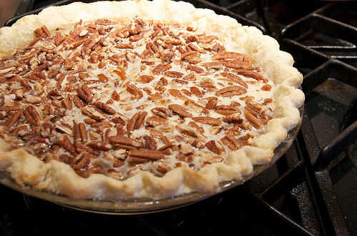 Si quieres decorar con los primeros pocos dígitos de π como lo he hecho, rodar hacia fuera los restos de masa después de poner la tarta en el horno y cortar sus números. Después de la tarta en el horno cerca de la mitad el tiempo de cocción, lo saca, arreglar sus números en la superficie (que debería ser suficiente). Con un huevo batido suavemente un cepillo les ayudará a conseguir suficiente color y ayudar a cumplirlos, pero no es estrictamente necesario. Coloque el pastel en el horno para el tiempo de cocción restante.