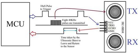 En este proyecto, estamos utilizando un sensor de distancia ultrasónico. Genera ondas de sonido más allá del alcance del oído humano y mide distancia calculando el tiempo requerido por estas ondas choca con un obstáculo y volver. Esto es similar al principio utilizado por los murciélagos.