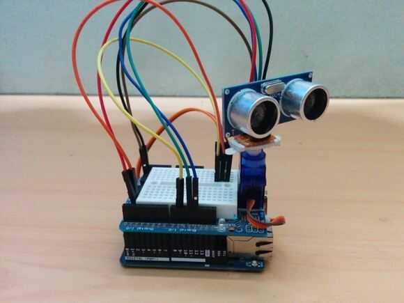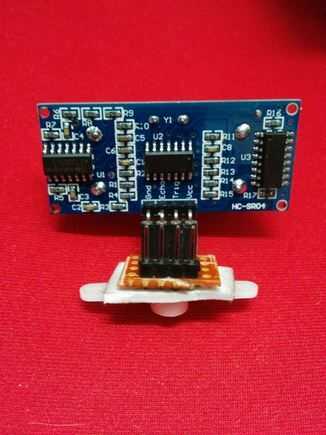 Utilizando un pequeño trozo de PCB de propósito general, un pequeño encabezado por la HC-04 y adjuntarlo a un cuerno del servo con un trozo de cinta de doble cara.