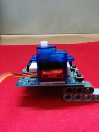 Este paso es opcional, pero para hacer el sistema más compacto, he unido el servo a la pieza salientes del escudo protoboard usando cinta de doble cara así.