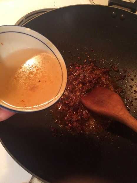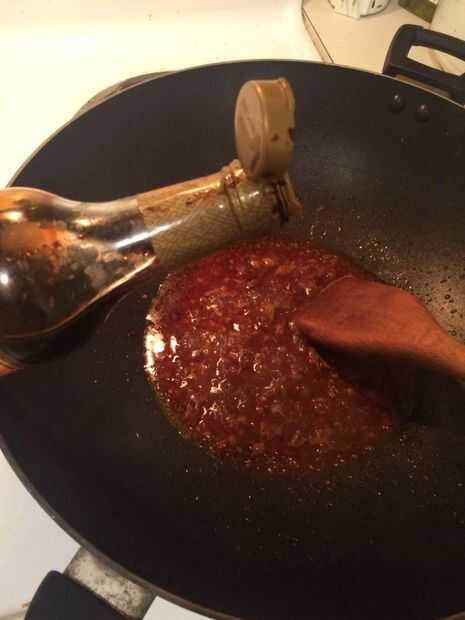 Después de alrededor de 1 o 2 minutos, añadir el vino de arroz (vino amarillo) y el ajo picado. Mezclar bien.