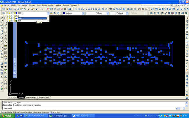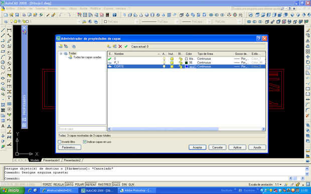 B - Después crearemos una capa llamada CORTE, a la cual asignaremos las propiedades necesarias (y esto funciona según las características de cada máquina desde la imprimáis), para interprete que lo acabamos de dibujar mar para cortar (y no para grabar, por ejemplo). Como todas las piezas se van a cortar, no en de heno nada grabar este caso, lo pasamos todo a la misma capa de CORTE.