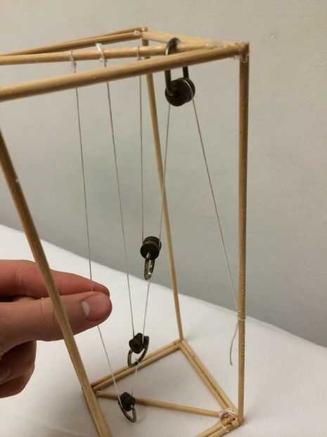 Recuerda daquele palito deixamos reservado? POIs bem, pegue s uma roldana ja colada e passe por ele, deixe a solta e cole o palito no resto suporte. Passe um pedaço de barbante de mais ou menos 30 cm por dentro da roldana e amarre na lateral (para facilitar na montagem); logo pegue s outra roldana e passe pelo mesmo barbante da 1ª, porém, deixe a de ponta-cabeça (com un ancho para baixo e amarre un extremidade no do barbante mesmo palito em que una está de roldana de 1ª. Amarre outro pedaço de barbante na ancho da 2ª roldana (esta virada para baixo) e passe por dentro de outra roldana (también virada para baixo) e forjados no mesmo palito. Repita este processo mais uma vez e deixe un ultima roldana (4ª) virada para baixo como como outra porém não forjados mais nada nela. Deixe os fios amarrados no palito o mais vertical posible em es como roldanas eles passaram, pois assim o sistema fica mais equilibrado. Cole una roldana de primeira (é una unica virada para cima e esta presa no palito) com cola branca e faça o mesmo nos barbantes presos ao palito.