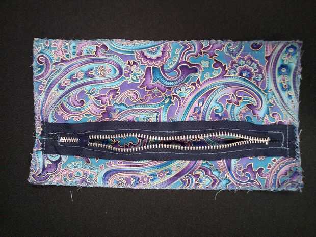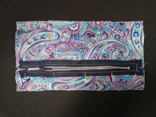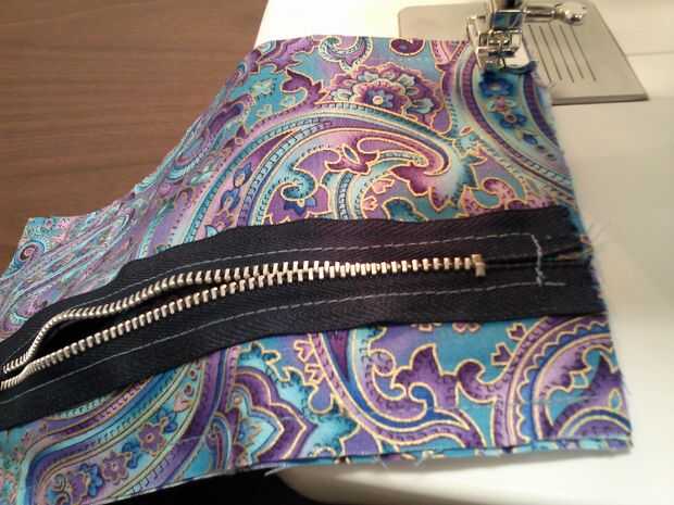 Coloque el pie prensatela regular de vuelta en la máquina de coser. Abra la cremallera y la parte delantera de la marca del perno hasta la bolsa a lo 5 "x 9" pieza de la tela, derecho. Coser alrededor de los 4 lados. Zig-Zag alrededor de los 4 lados para evitar que los bordes se deshilachen. Gire a la derecha hacia fuera. Prensa.
