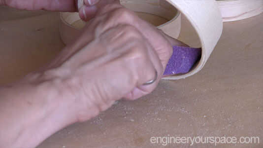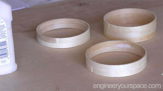 Hice los anillos con aros de madera bordado de 4"(7), 3/4" y 2" ancho hierro en bordes (abedul). Pegué los aros interiores de los anillos bordado con cola para madera para hacer 2 pilas de 2 aros y 1 pila de 3 aros. A continuación os adjunto hierro en ribete de madera en el exterior de los anillos y lijar los bordes y el interior de los anillos.