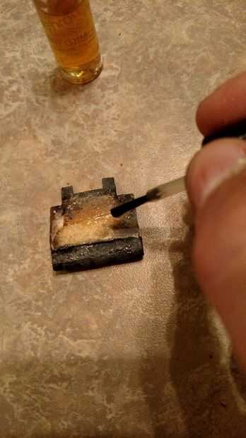 A continuación, aplique algunos goma de espíritu en la parte trasera de uno de sus bisagras. Cepillo en como si fuera esmalte de uñas. No demasiado gruesa. Deberá contar hasta 30 antes de que salga en la piel. Se volverá pegajoso y entonces usted puede presionar en su lugar. Si usted manténgalo apretado durante otros 30 segundos, usted debe ser bueno para ir todos los días mientras usted no está sudando profusamente.
