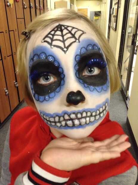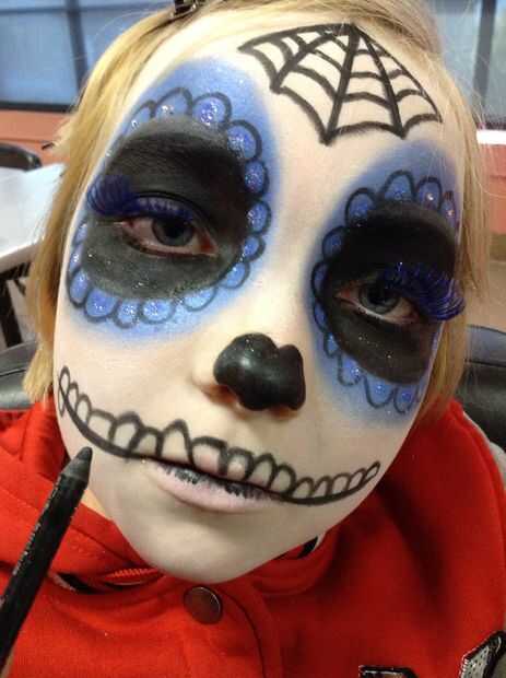 Utilizando el mismo método de aplicar el negro en los ojos, líquido trazador de líneas a lápiz, cuidadosamente extraje una línea delgada de una mejilla a la otra a donde recurro a los dientes. Añadir con cuidado los dientes utilizando sólo lápiz de revestimiento de ojo negro para el control. Luego con un cepillo pequeño sombra ir alrededor de cada diente con el color azul aqua y luego con sombra azul.